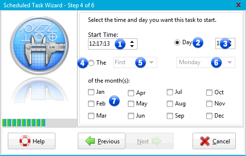 Selecting this option will disable combo boxes spin controls (5) and (6). Spin control (3) will be enabled. The scheduled task will be run on the day of the month shown in spin control (3).